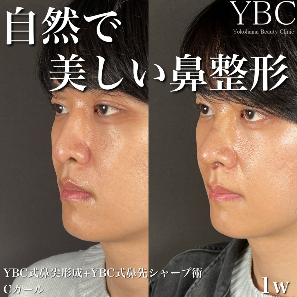 このお悩みを解決させるために、YBC式鼻先シャープ術、鼻尖形成、Cカール形成を行いました。