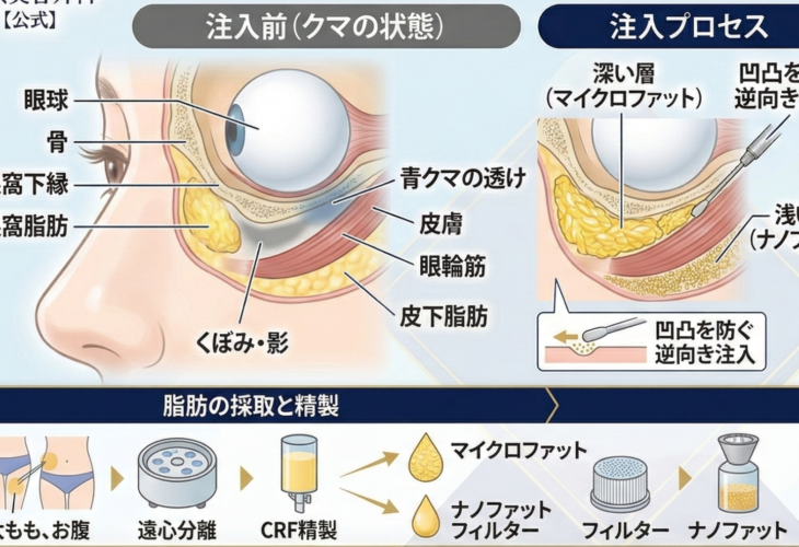 目の下のクマ治療において、凹みや皮膚の薄さを改善するボリュームアップの手法として「脂肪注入(ファットグラフト)」は広く行われています。特に、近年では脂肪を細か…