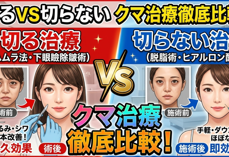 目の下のクマ治療を検討する際、選択肢の多さに迷う方は少なくありません。大きく分けて「手術(外科的治療)」「注入(フィラー治療)」「スキン治療(レーザー・外用薬)…