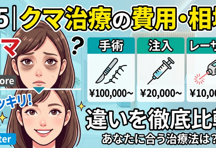 目の下のクマ治療を検討する際、多くの方が気になるのが「費用」と「相場」ではないでしょうか。クマ治療は自由診療であるため、クリニックや選択する治療法によって料金体…